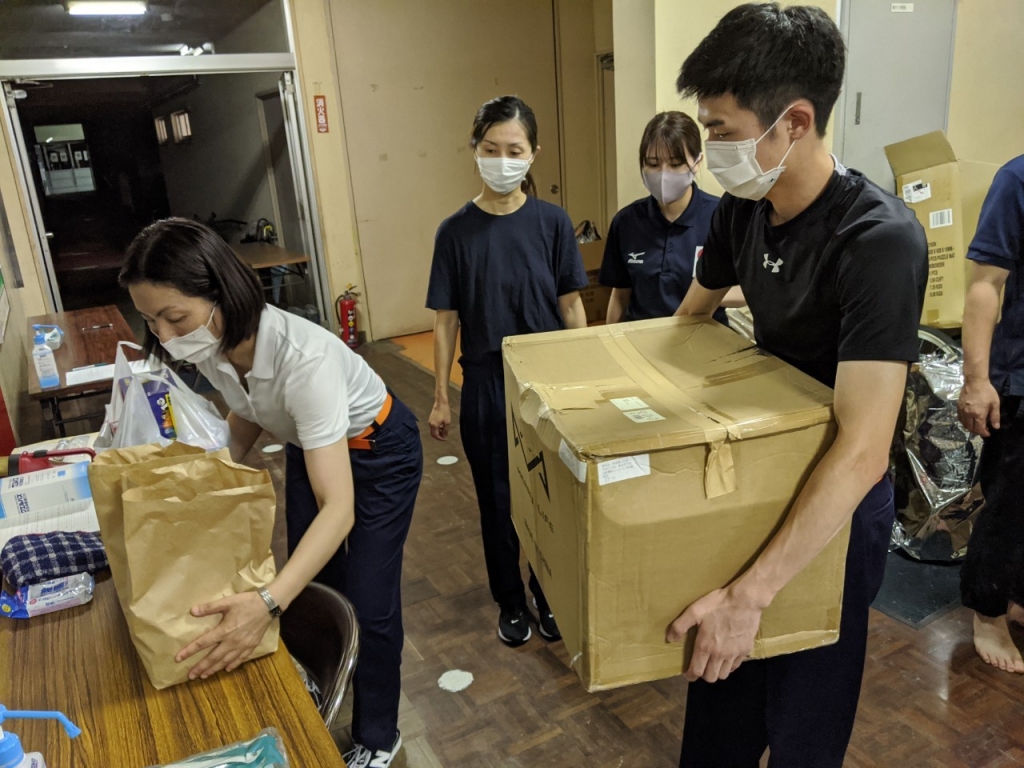 球磨村からの避難者合わせて、今夜には560名になる見込みです。ARROWSは人吉スポーツパレスと人吉東小学校で「非接触型検温器」「避難所運営パンフレット」「マスク」「化粧品」「インゼリー」「消毒液」を支援、また避難所スタッフの方々へ差し入れを行いました。