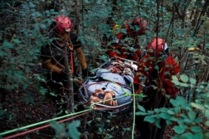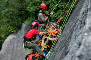 【ロープレスキュー訓練】では、山岳地帯あるいは都市部での災害時に自身の安全を確保しつつ、要救助者にいち早く接触するために必要な技術を磨きます。