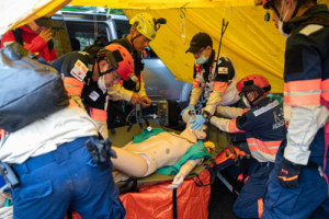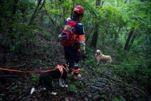 【定期訓練】これまで学んできたレスキュー技術・医療手技・ロジ能力を活かし、行方不明者を救出する想定訓練として、災害救助犬等を活用した捜索、発見後の迅速かつ適切な医療処置、搬送までの各段階を実際の現場を想定し実施しました。