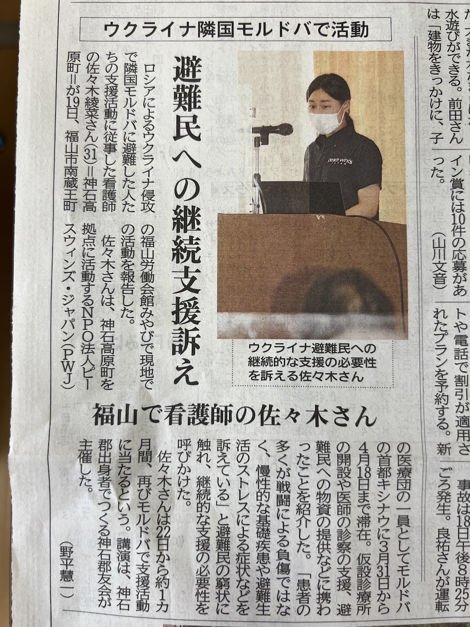 6月20日、中国新聞にて佐々木看護師の活動報告の様子が掲載されました。