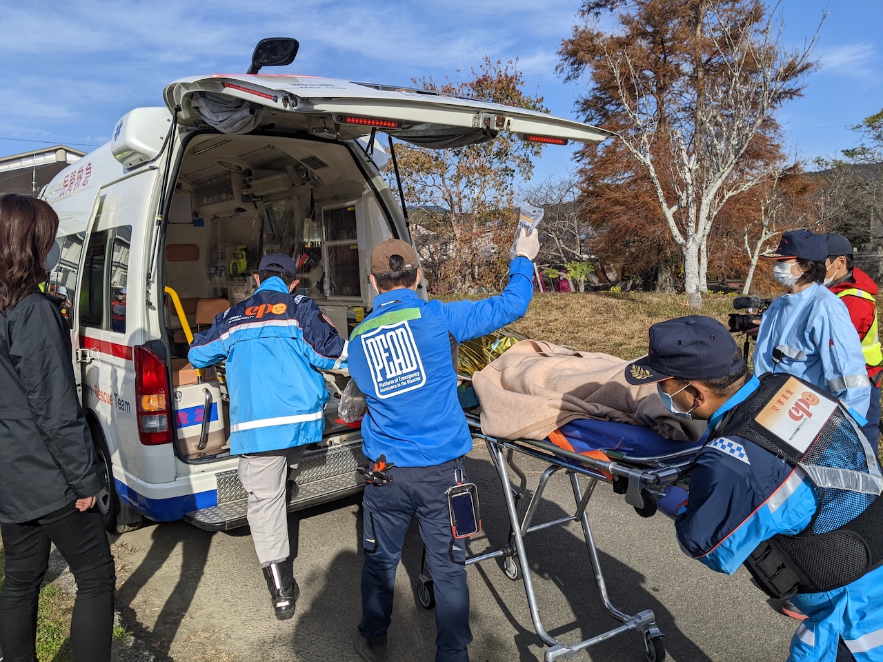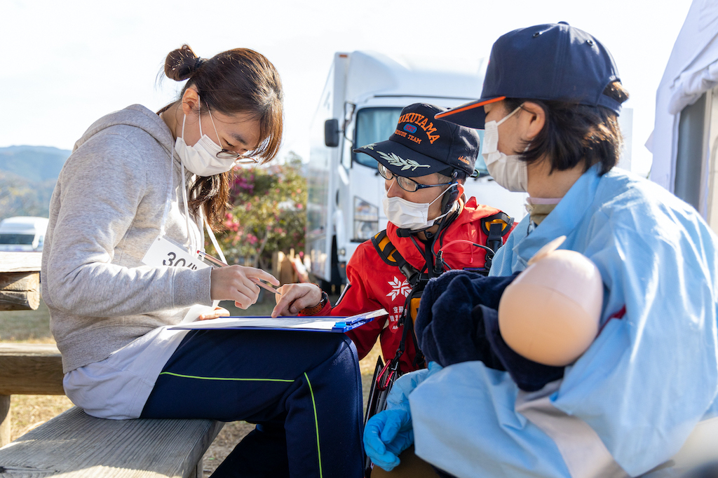 1泊2日の訓練では、南海トラフ級巨大地震の発災4~5日目を想定してフィールドホスピタル(野営病院)を開設、捜索救助・患者の搬送から診療・処置まで、一連の支援活動を連携して行いました。