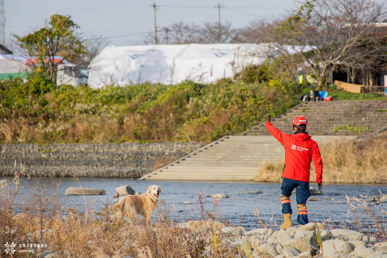 フィールドホスピタルの対岸で行った捜索救助訓練では、災害救助犬が行方不明者および遺体の捜索を行いました。