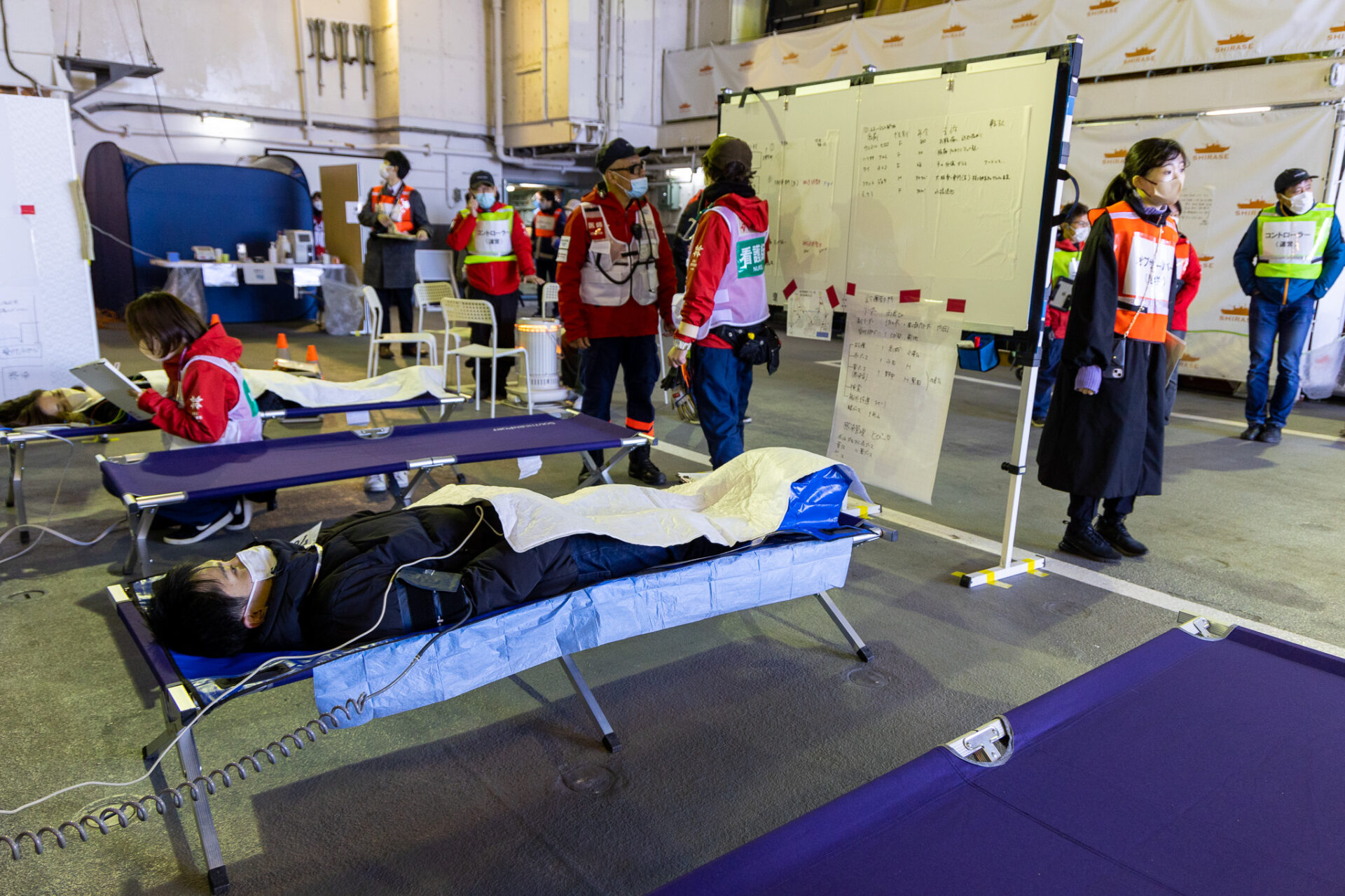 指揮所や診療エリアにおいては、(訓練想定として)重症化した患者の病院搬送調整はもちろん、行き場のない離島の島民(高齢者)の一時受け入れ調整も行われました。船特有の揺れにも注意が必要で、物品の配置や患者の導線にも気を遣います。
