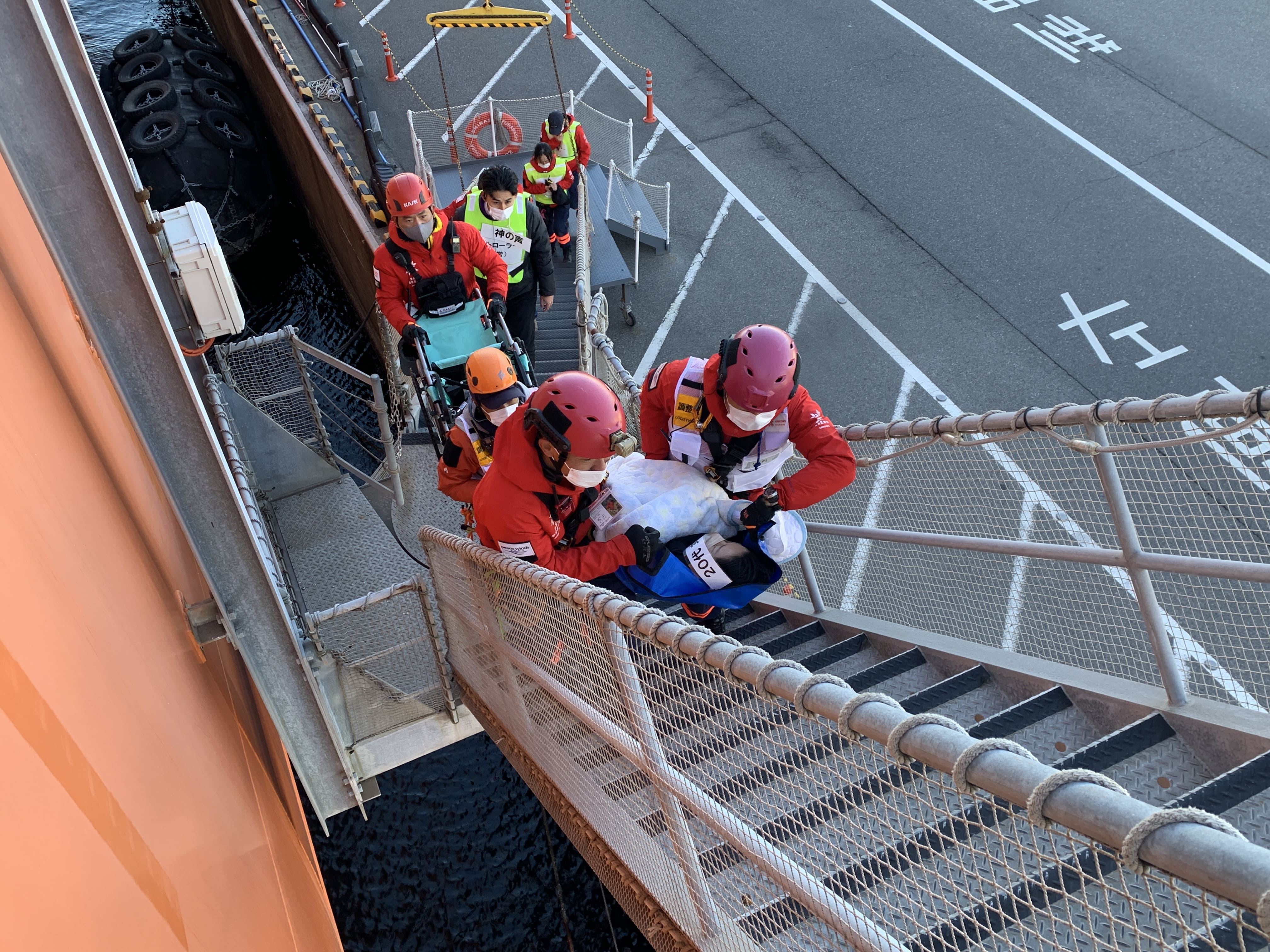 今回は船橋港に係留している、SHIRASE5002という1983年から2008年にかけて南極観測船として活躍した船内で実施し、内閣府による災害医療における船舶を活用した実証訓練事業として行われました。洋上活動における各種調整や船内外への患者搬送、船内での応急処置・安定化を実施することで、実災害時の活動を検証することを目的としています。