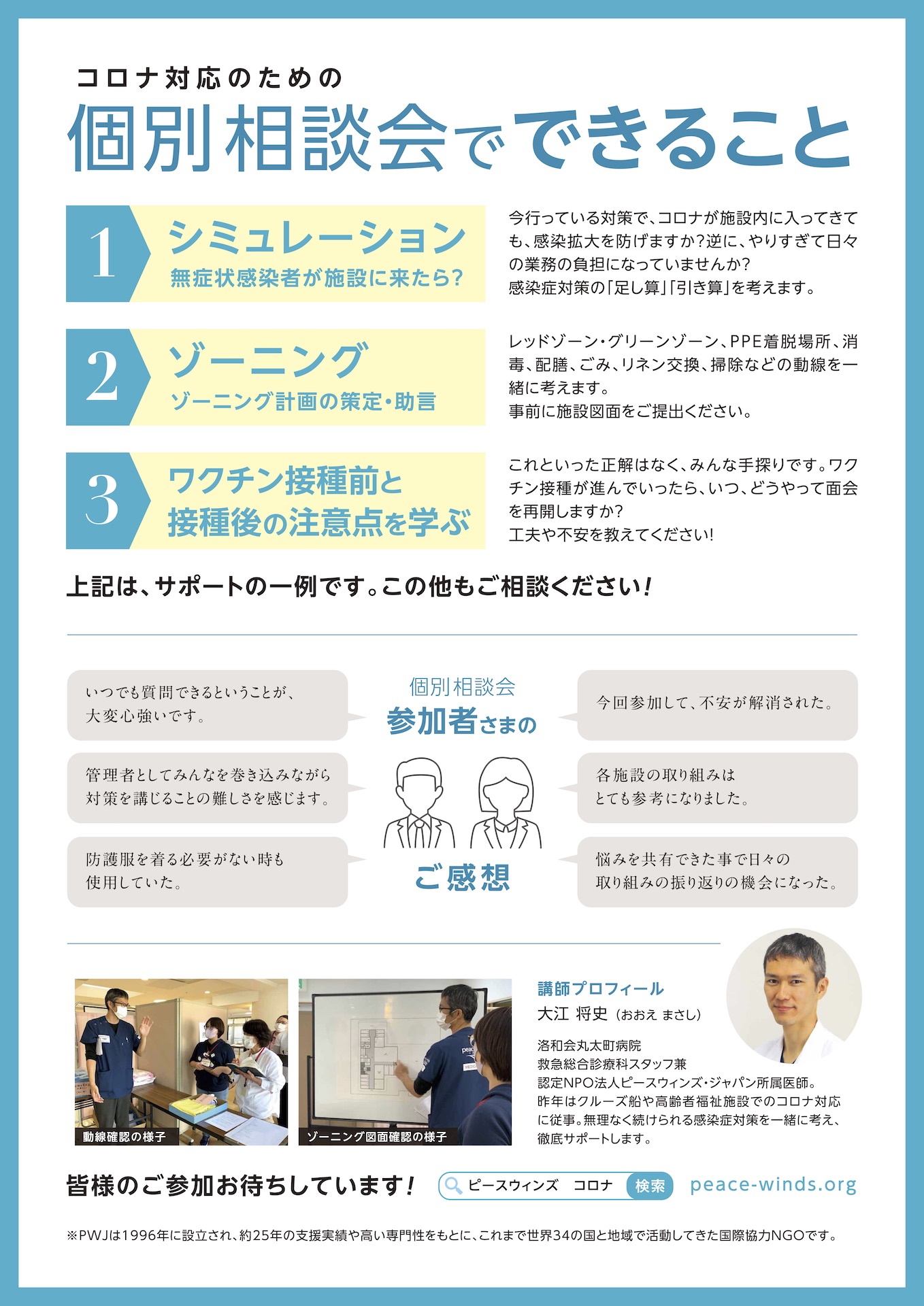 空飛ぶ捜索医療団”ARROWS”を運営するピースウィンズ・ジャパン(PWJ)は、ジャパン・プラットフォーム(JPF)の助成を受け、新型コロナウイルス対策支援の一環として、福祉施設で働く職員の方向けに、個別相談会を実施いたします。