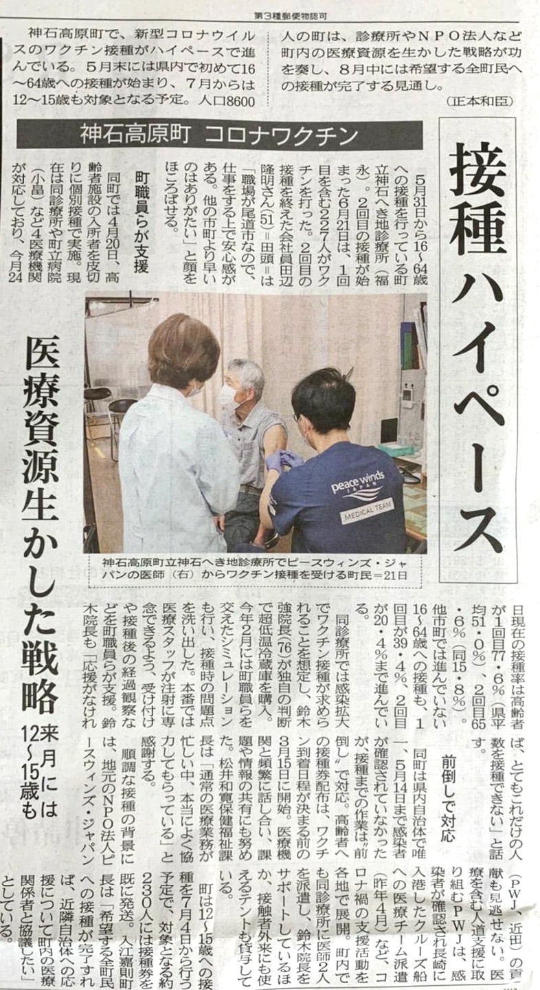 空飛ぶ捜索医療団ではワクチン接種に対して医師を派遣、接種支援を実施しており、その様子が6月29日(火)の山陽新聞に掲載されました。